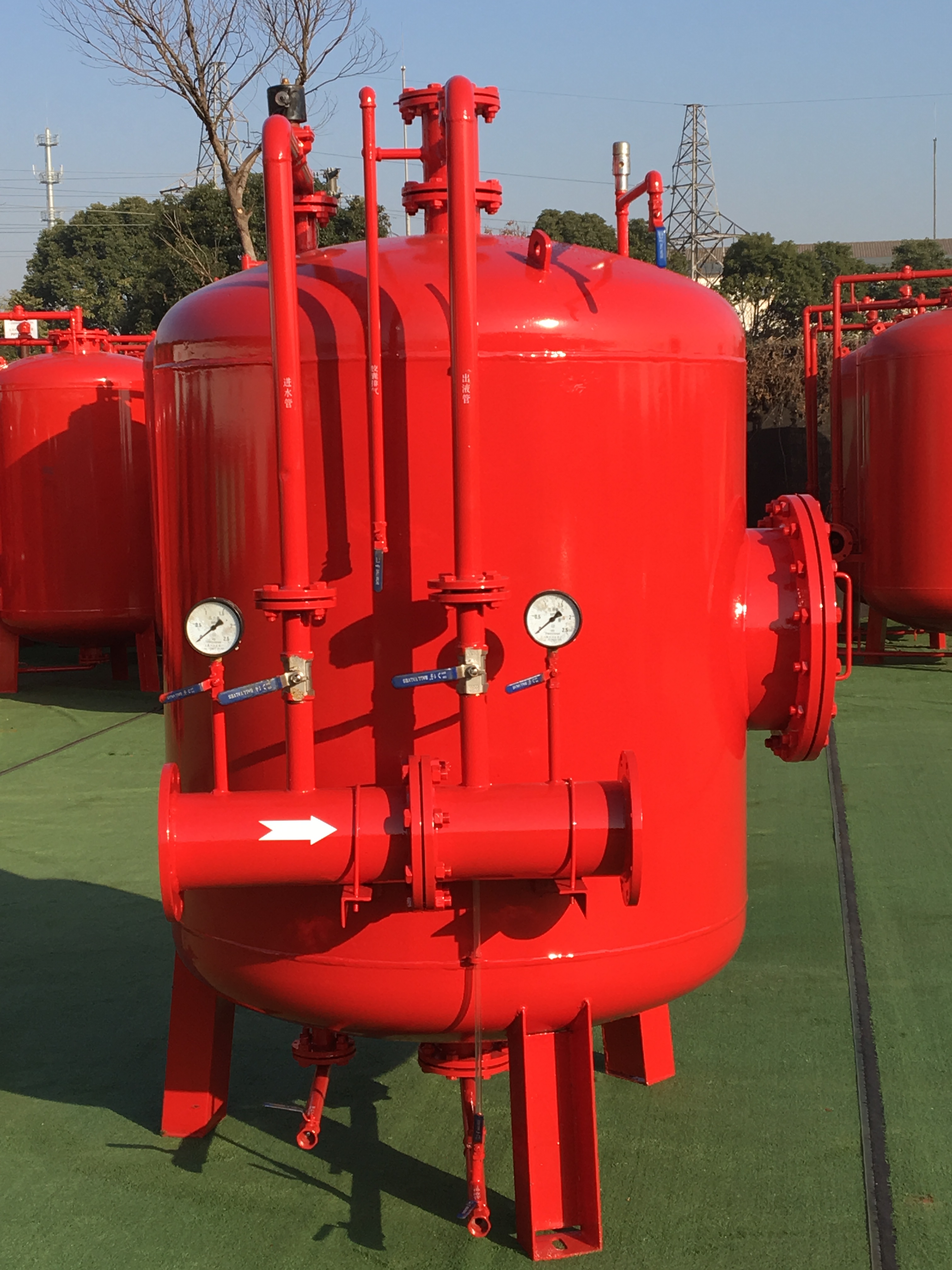 消防泡沫罐是由泵供給壓力水,將泡沫液按一定比例置換出來后與壓力水混合成泡沫混合液,由于膠囊將泡沫液與水隔開,泡沫液一次沒有用完,下次可以繼續(xù)使用且混合精度仍然穩(wěn)定、可靠,當壓力水經(jīng)過比例混合器時,一部分壓力水(3%~6%)由支管進入泡沫液儲罐內(nèi)擠壓膠囊,置換出等量的泡沫液與另一部分水(97%~94%)在比例混合器內(nèi)混合成泡沫混合液提供給泡沫產(chǎn)生裝置,產(chǎn)生空氣泡沫達成滅火目的。